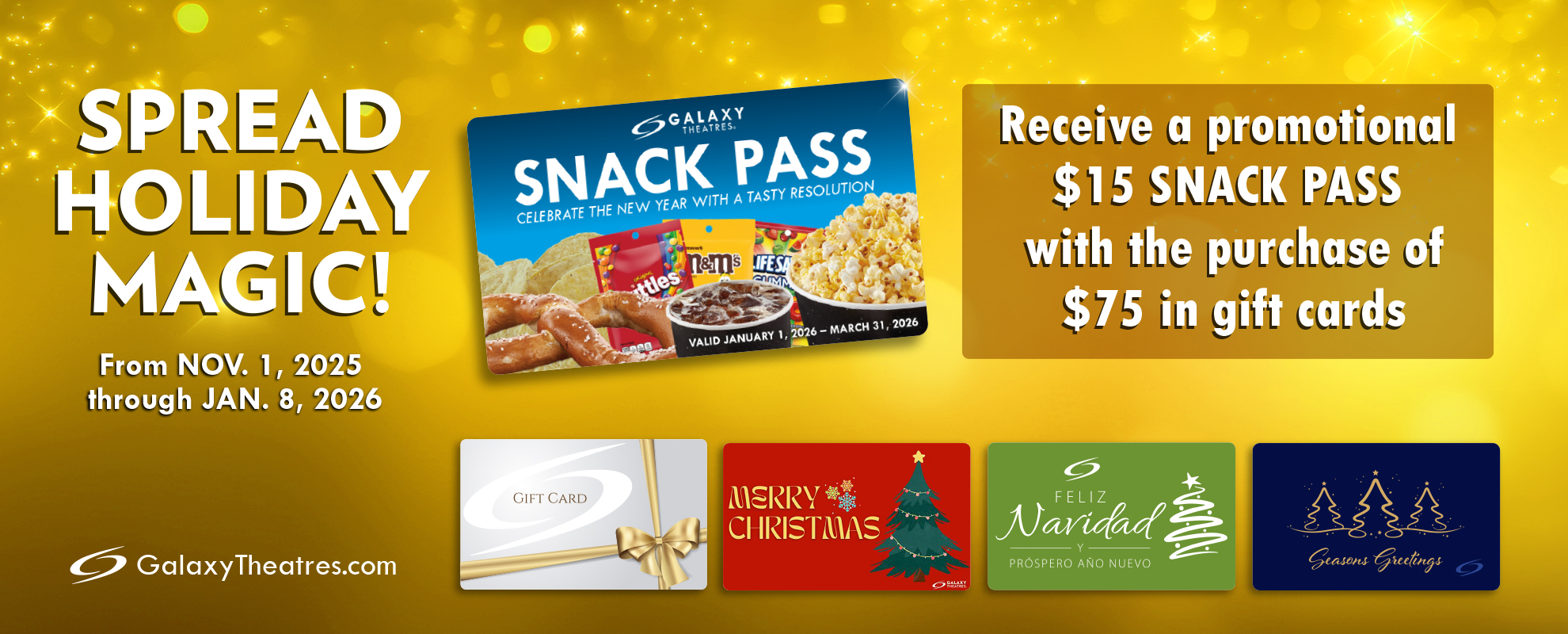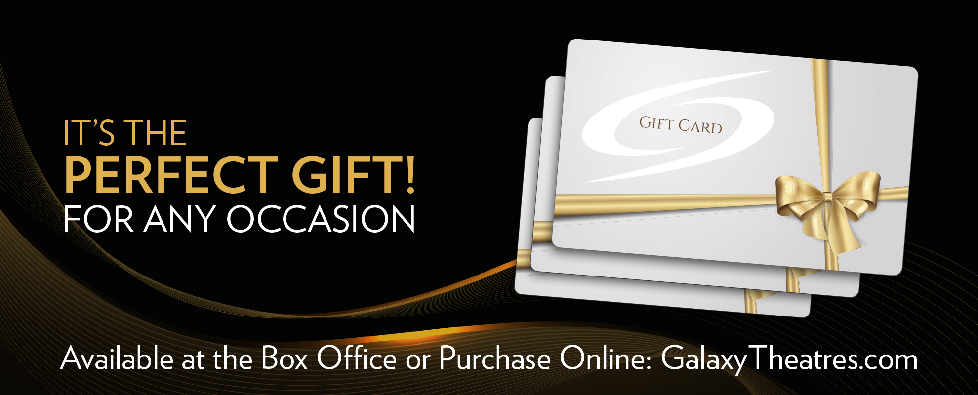 Galaxy Theatre Gift Cards may be used toward the purchase of tickets or toward concessions at any Galaxy Theatres location for up to the amount displayed.