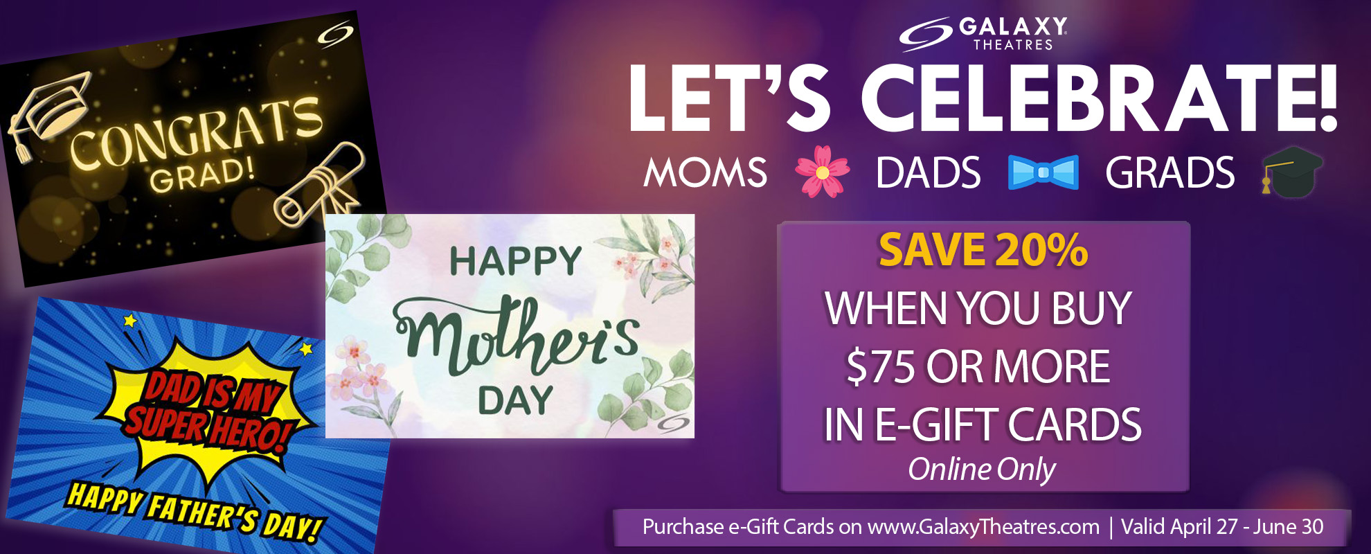 Galaxy Theatre Gift Cards may be used toward the purchase of tickets or toward concessions at any Galaxy Theatres location for up to the amount displayed.